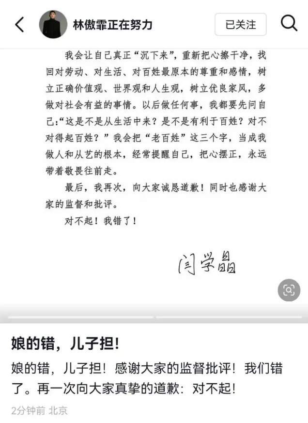 1月12日,闫学晶儿子林傲霏在个人社交账号转发闫学晶的道歉书,并留言“娘的错,儿子担!感谢大家的监督批评!我们错了。再一次向大家真挚的道歉:对不起!”
