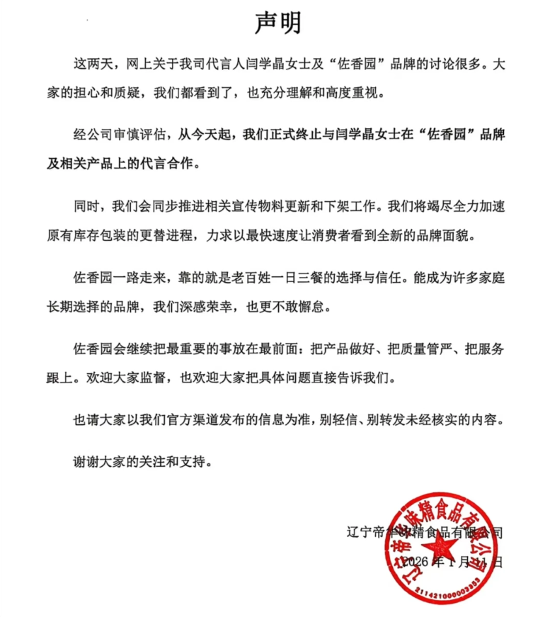 1月11日,辽宁帝华味精食品公司(下称帝华味精)发布声明称,经公司审慎评估,从当日起,正式终止与演员闫学晶在“佐香园”品牌及相关产品上的代言合作。
