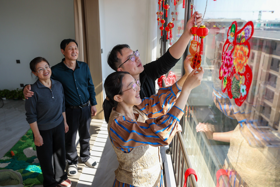 2月18日大年初二,牛佩瑶(右二)和家人一起在雄安家中布置过年的彩灯装饰。人民日报记者 张武军摄