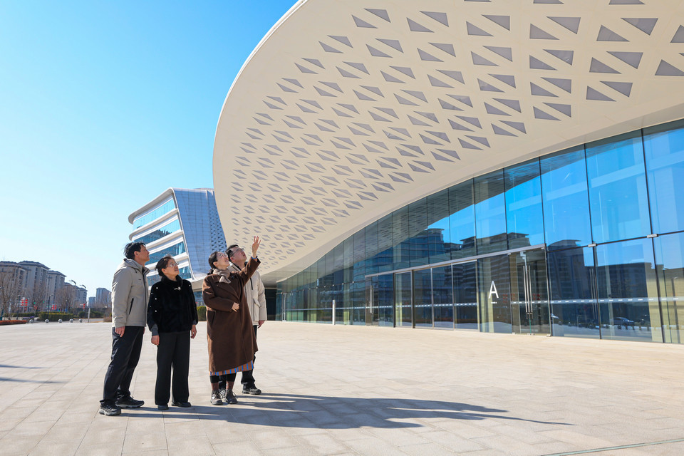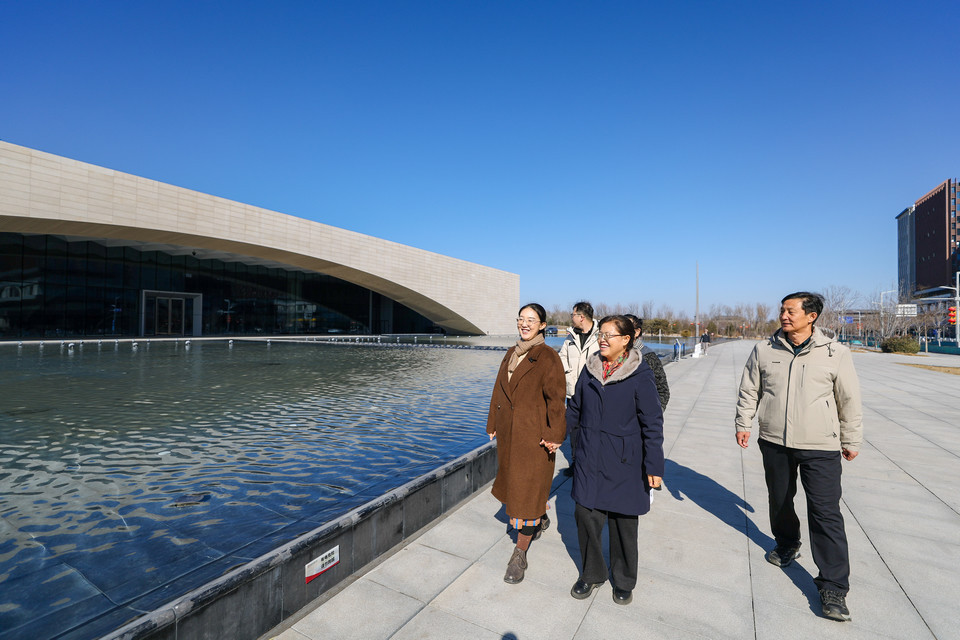 2月18日大年初二,牛佩瑶(左一)带家人来到雄安地标之一——雄安城市计算中心参观游览。人民日报记者 张武军摄