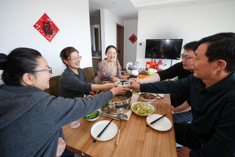 2月18日大年初二,牛佩瑶(左三)和家人们在家一起吃团圆饭。一家人举起茶杯碰杯欢庆。人民日报记者 张武军摄