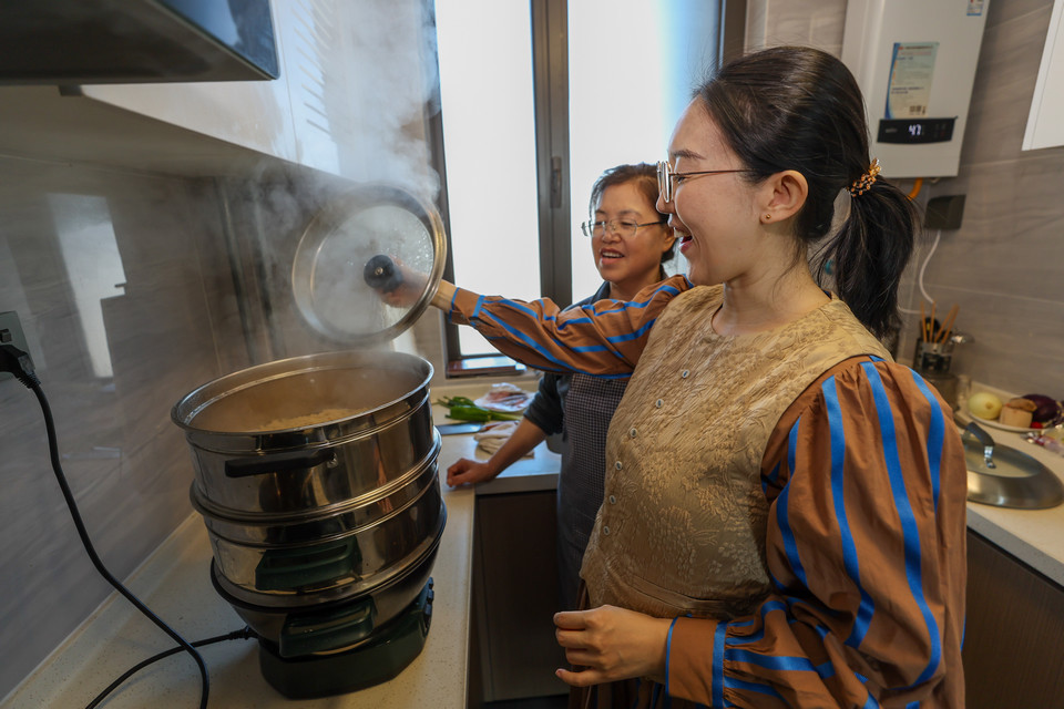 中午时间,牛佩瑶(右)和母亲一起在雄安家中的厨房做午饭。热气腾腾的莜面刚刚出锅,这是牛佩瑶老家的特色美食。人民日报记者 张武军摄