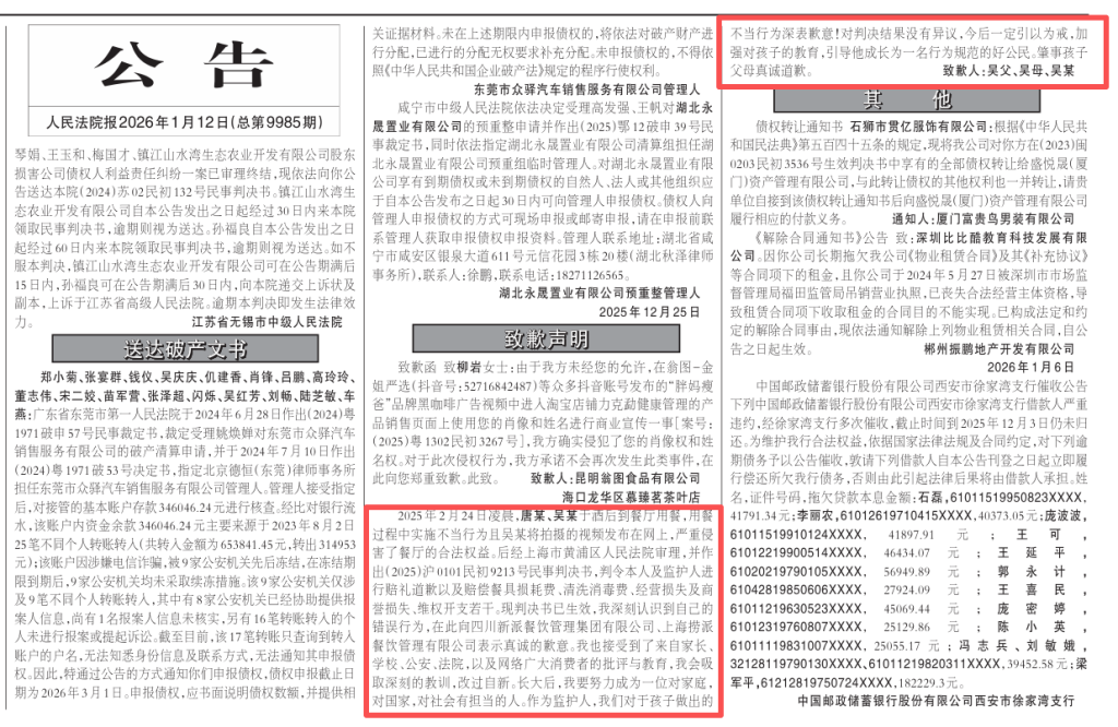 2026年1月12日股民钱包,《人民法院报》2版刊登了海底捞“小便门”当事人吴某及其父母的致歉声明。此前的1月8日,另一当事人唐某及其父母也已登报致歉。
