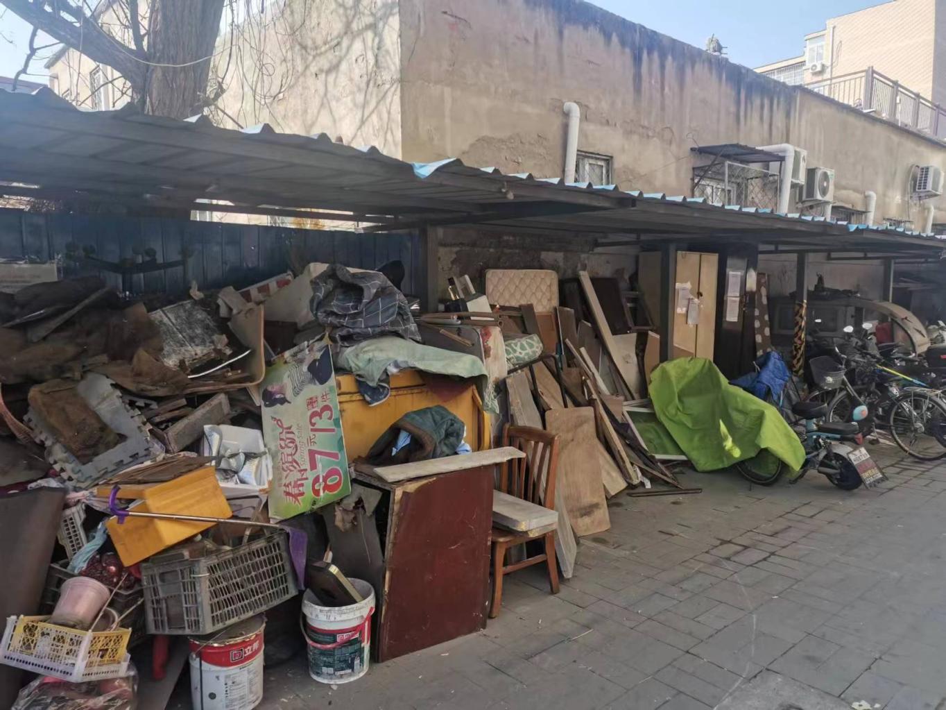 居民告诉记者,田村路29号院是建成于1981年的老旧小区,仅有1栋住宅楼,42户居民。早年间居民取暖靠烧煤,便在自行车棚里搭了煤棚,后来“煤改电”,家里变成了自采暖,煤棚虽然用不上了,但又逐渐被用来堆物堆料。近年来,公共空间被挤占、安全隐患突出等诸多问题成为居民的一大困扰。