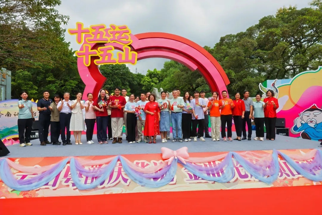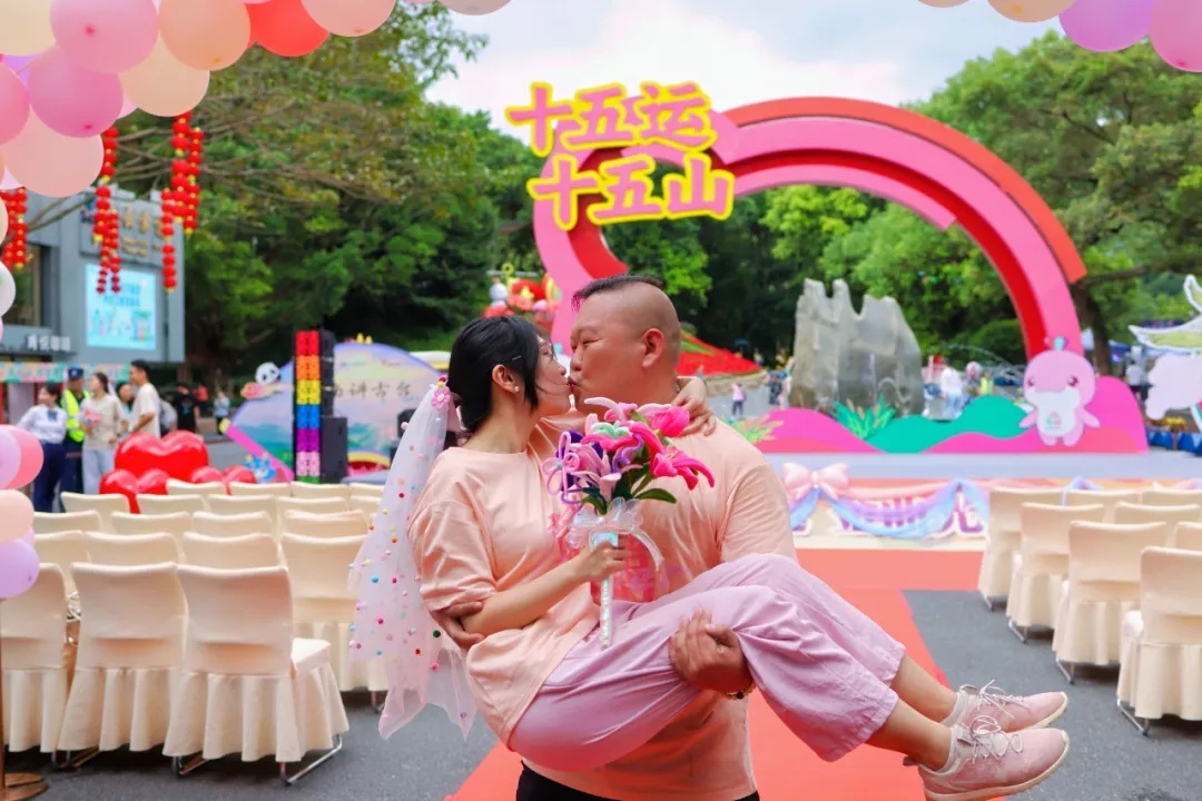 10月6日上午8时30分,9对新人在白云山南门乘坐装饰喜庆的电瓶车,开启了“爱在云山”上行之旅。新人们换上“爱的装备”,身穿定制的多巴胺色彩囍字运动服和头纱等待生命中重要的时刻到来。